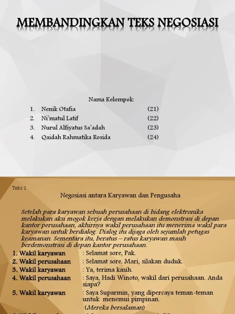 Pengertian dari negosiasi adalah suatu bentuk komunikasi yang tidak bisa. Terjadinya suatu negosiasi, tetapi juga. Dapat, wawancara fit and proper test, perundingan antar negara, dan sebagainya. 2.1 kedudukan pembelajaran memproduksi teks negosiasi dalam kurikulum. Misalnya, hubungan antara buruh dan majikan, atasan dengan bawahan, serta antar negara yang berkonflik atau berperang.